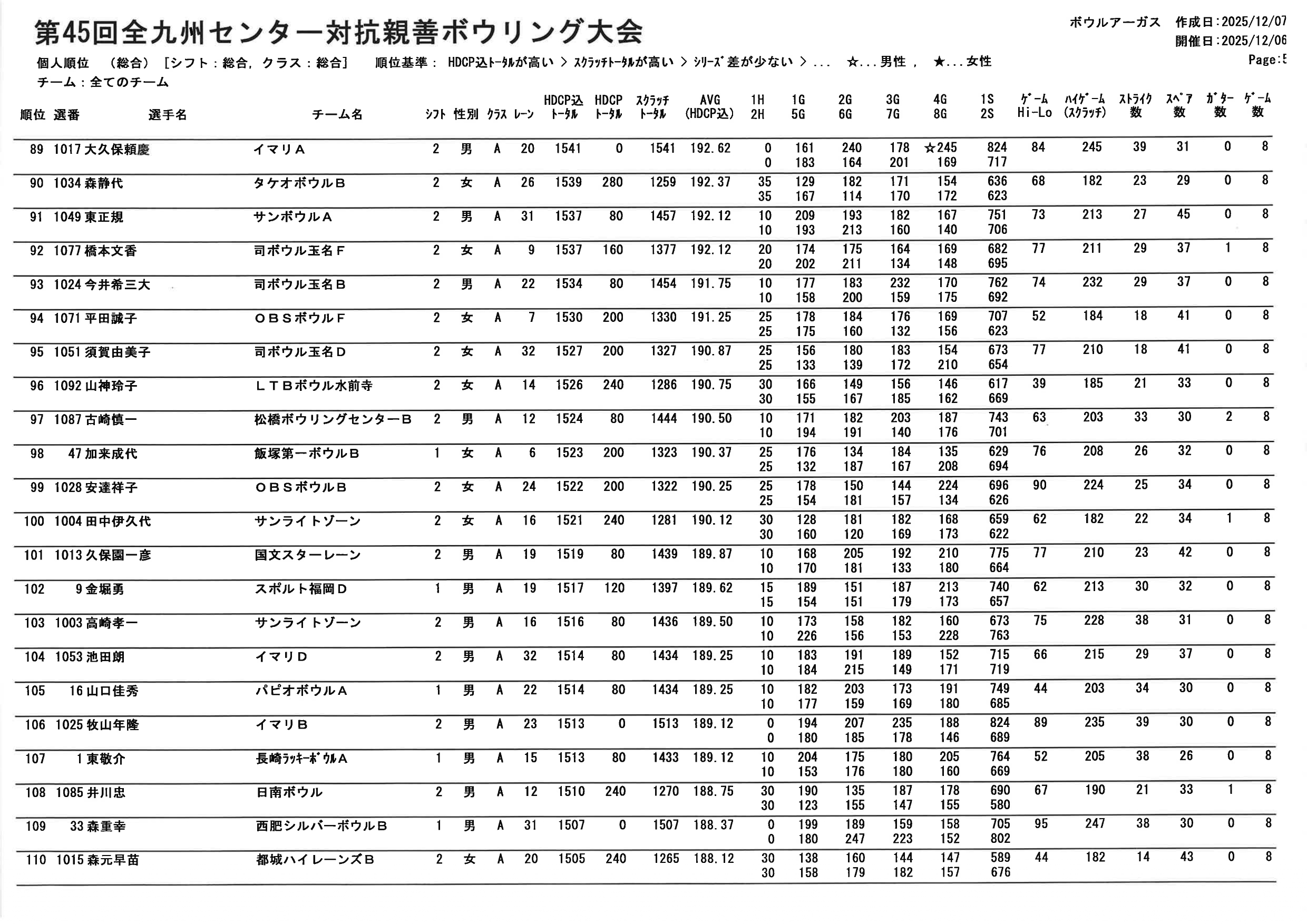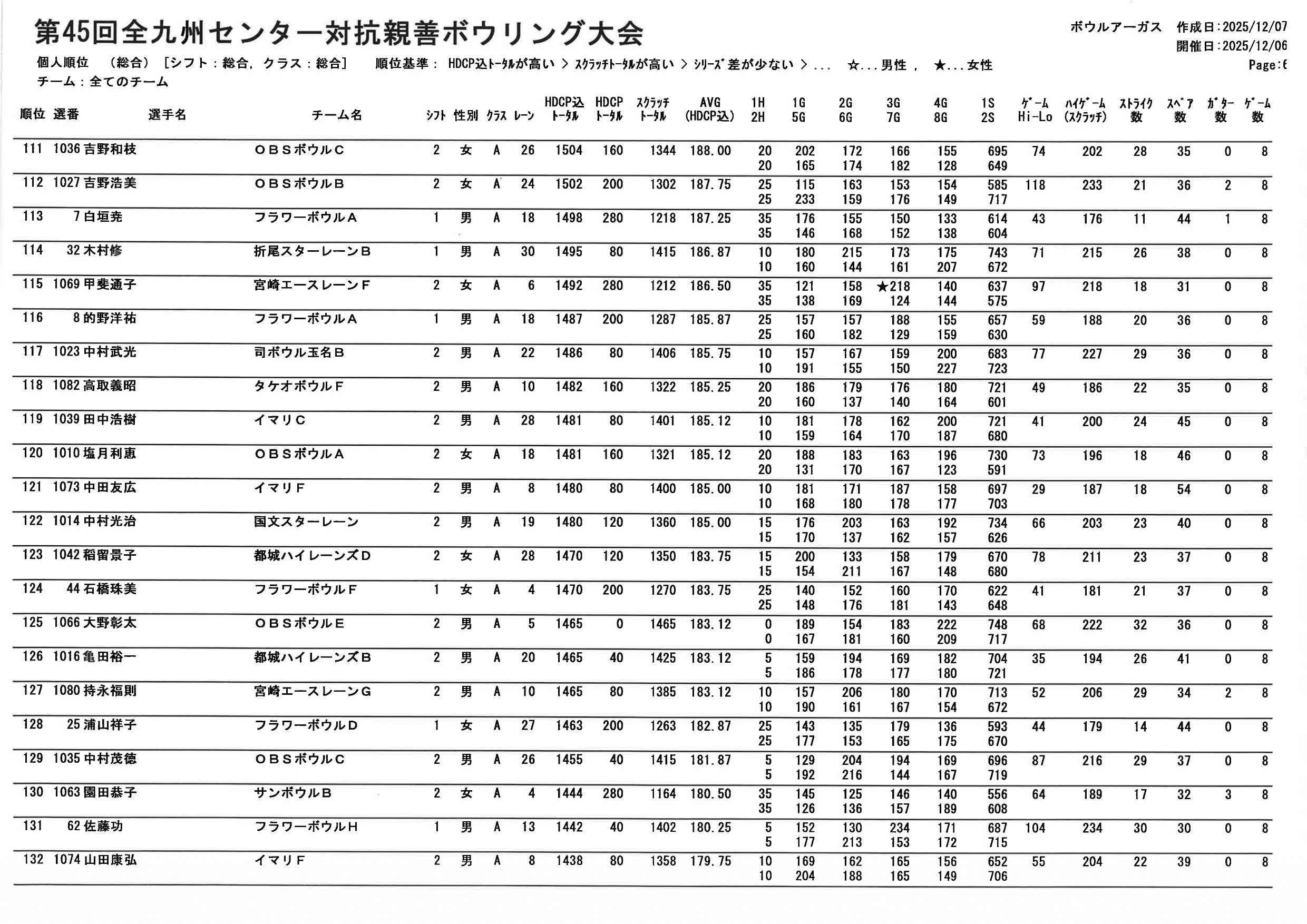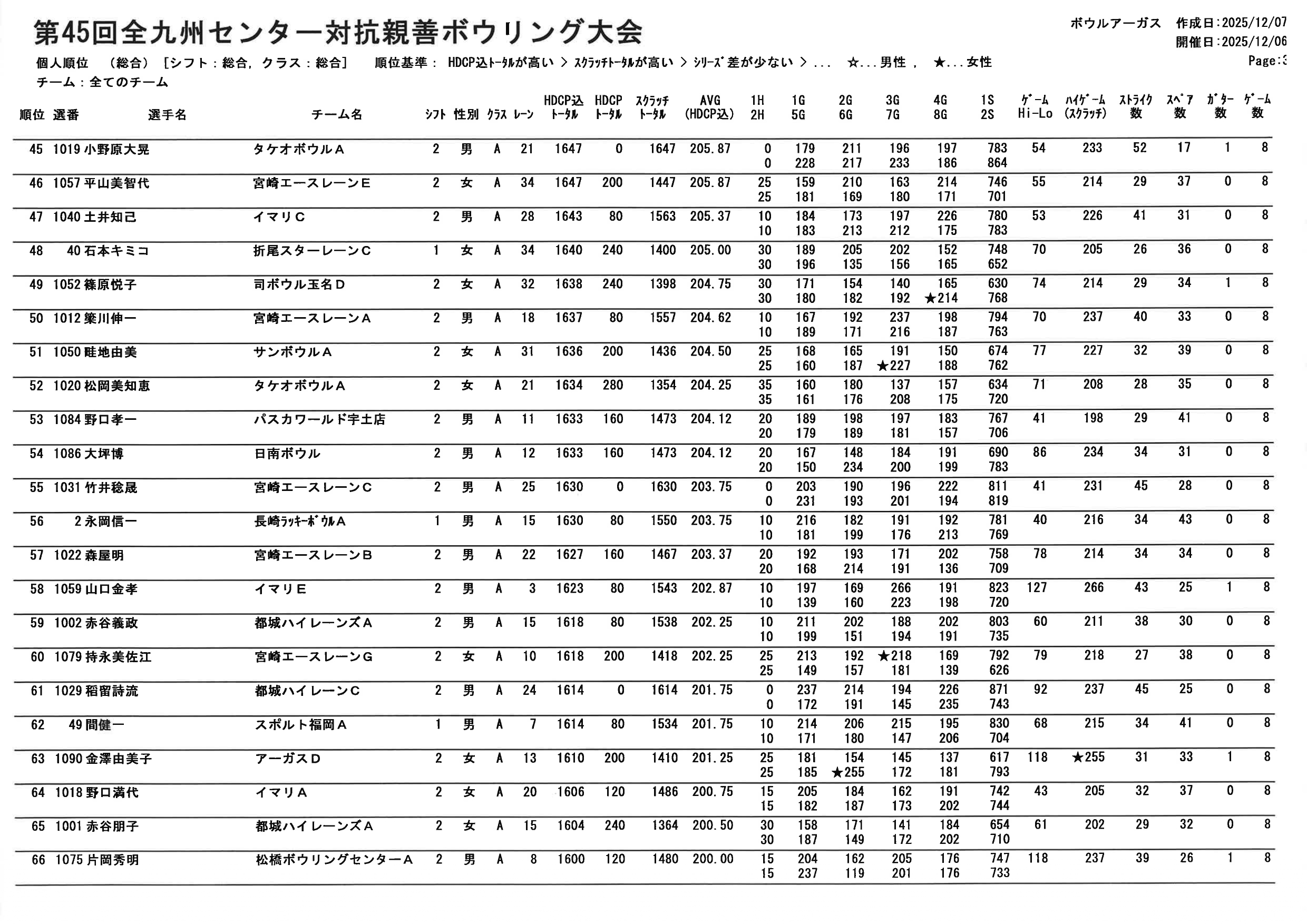 【第45回全九州センター対抗親善ボウリング大会 個人順位PDF】