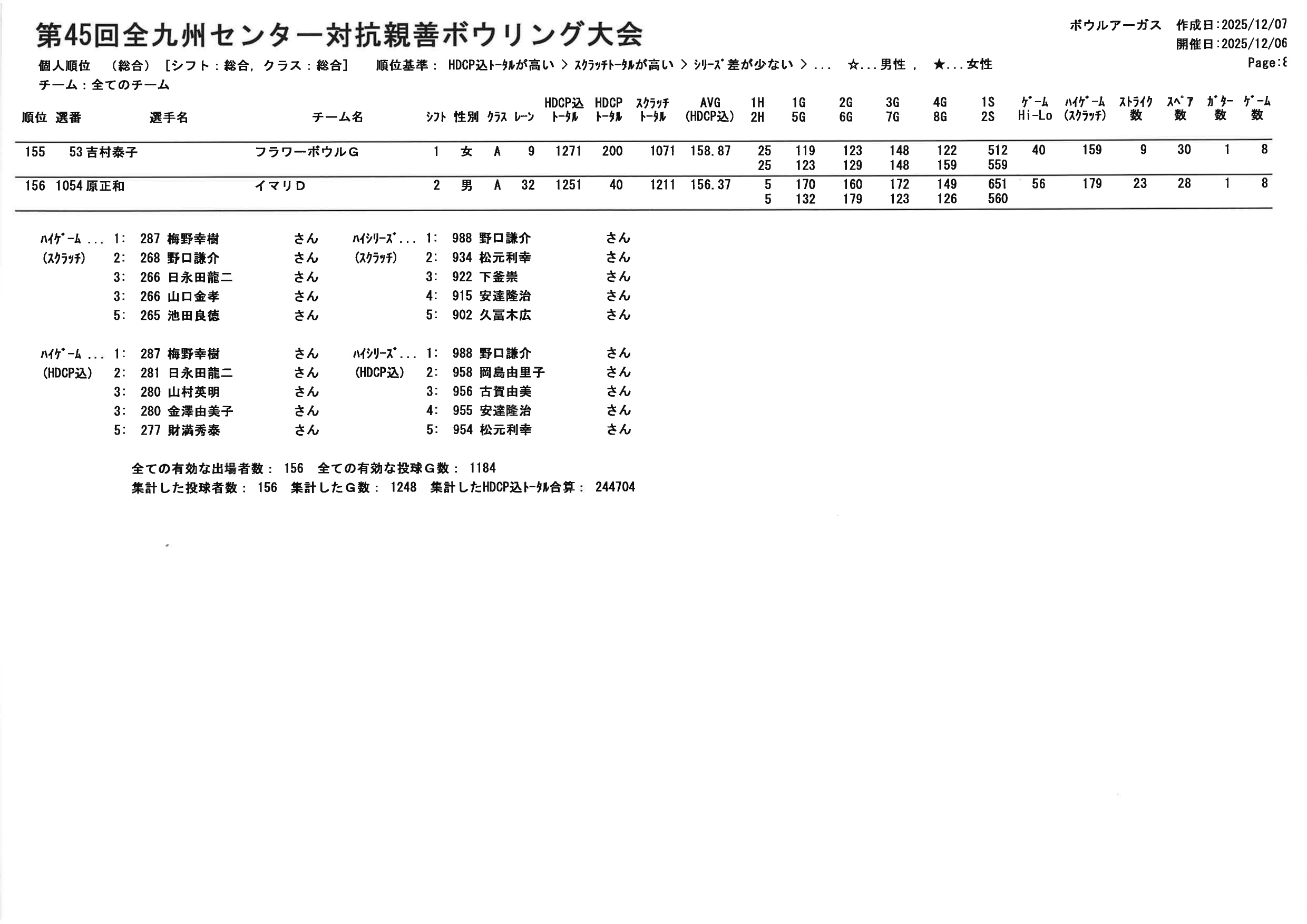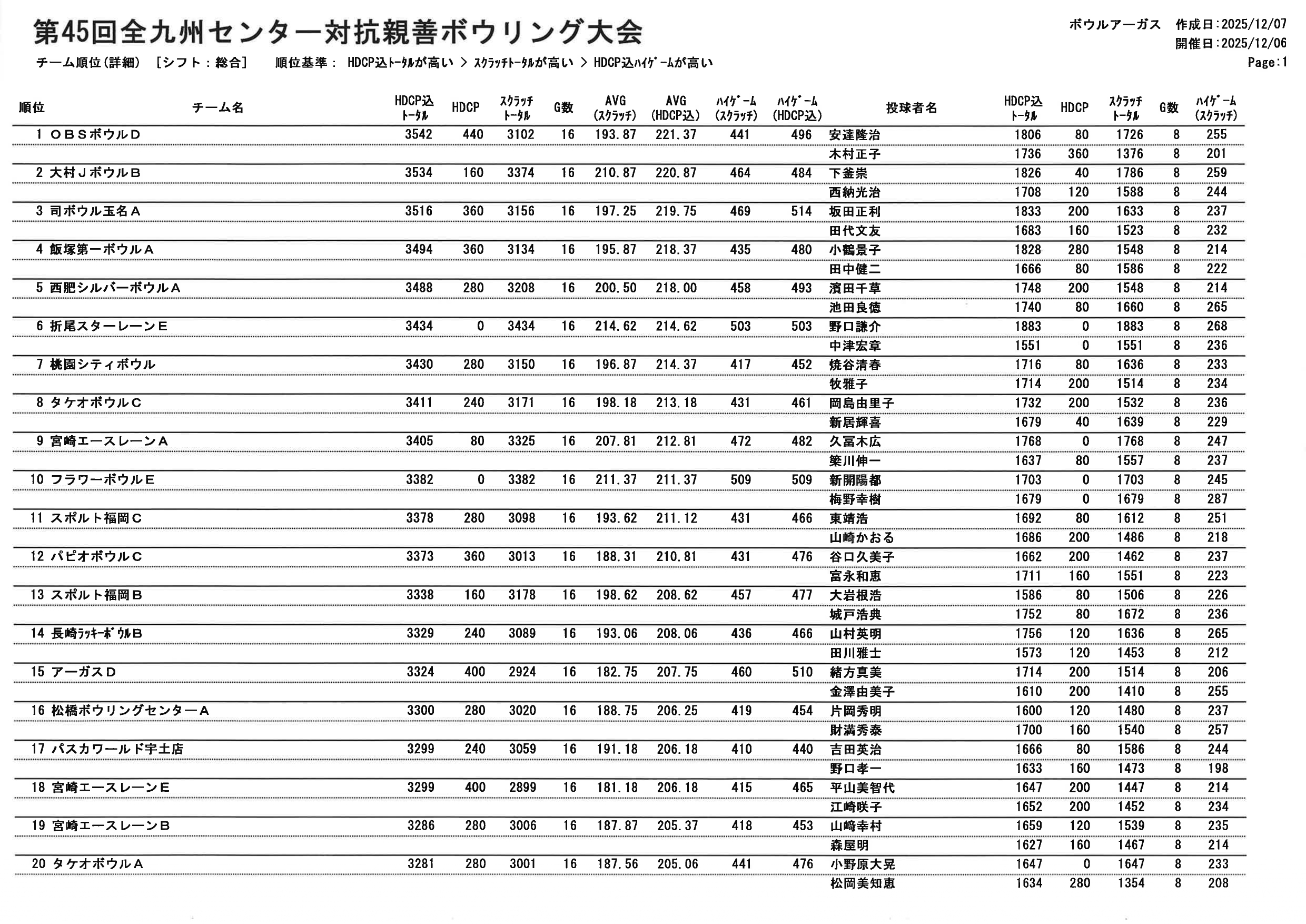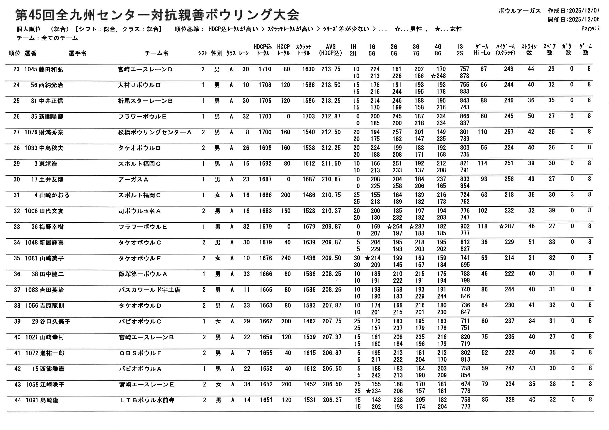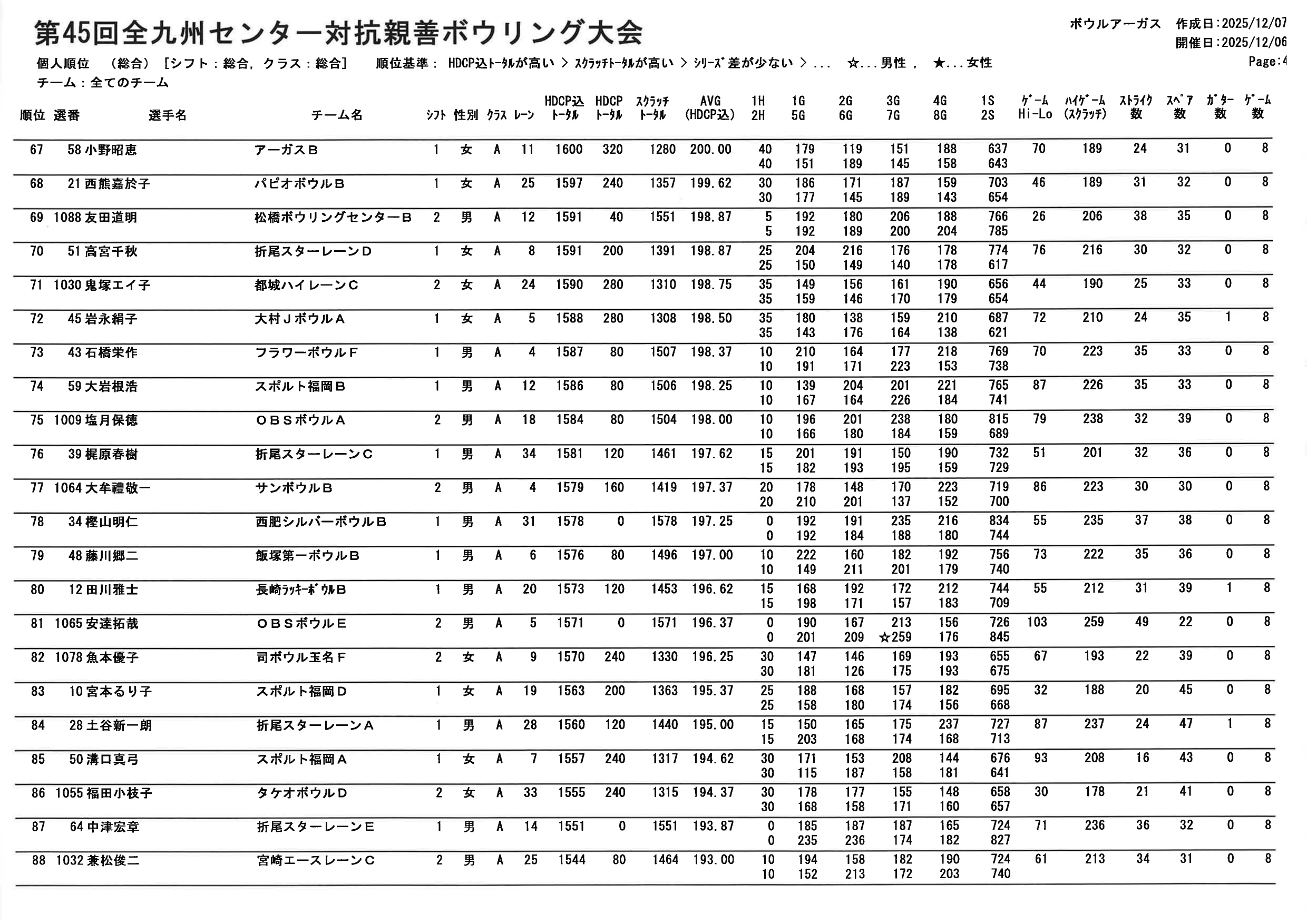 【第45回全九州センター対抗親善ボウリング大会 個人順位PDF】